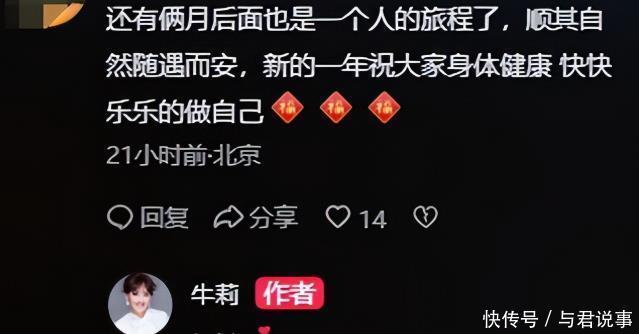 结语 牛莉,平凡出身却大放异彩,事业家庭双丰收,活出真我风采。 如今,她还未回应“离婚”传闻,但不管离婚与否,她都是属于自己的人生赢家! 人生如歌,激励追梦人前行。